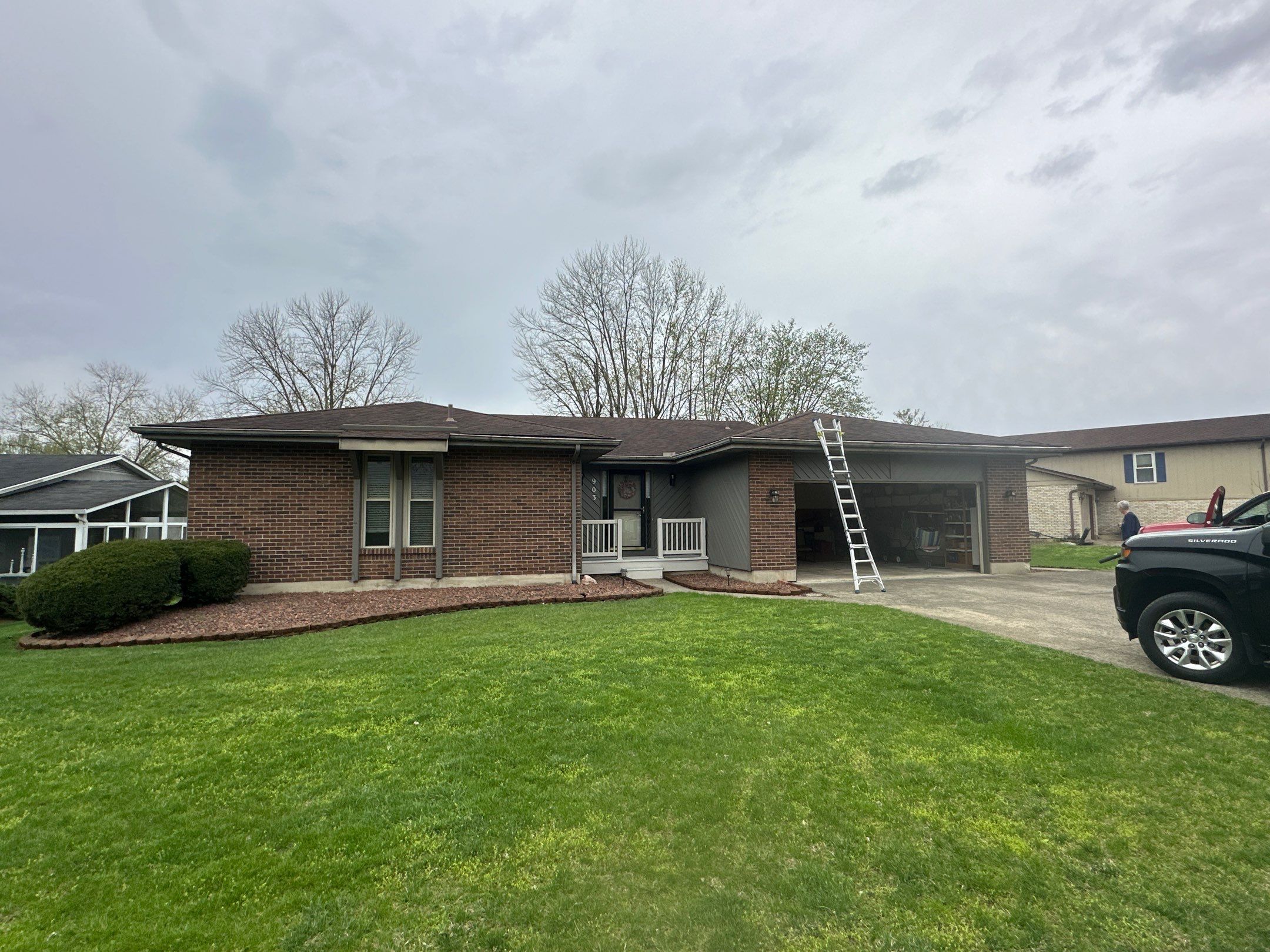 The homeowner’s $7,500 investment in new gutters complements the roof replacement by providing complete water management. Quality gutters collect runoff and direct it away from foundations preventing the erosion, basement moisture, and structural problems caused by uncontrolled roof drainage. The brown gutters visible coordinate with the roofing colors creating cohesive appearance.